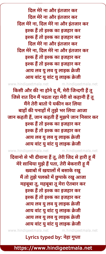 Lyrics of Dil Mere Na Aur Intjar Kar - दिल मेरे ना और इंतजार कर