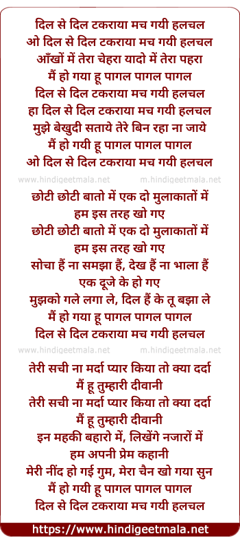 Lyrics of Dil Se Dil Takraya Mach Gayi Halchal - दिल से दिल टकराया मच गयी हलचल
