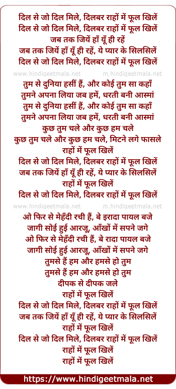 Lyrics of Dil Se Jo Dil Mile, Dilbar Raho Me Phul Khile - दिल से जो दिल मिले, दिलबर राहों में फूल खिलें