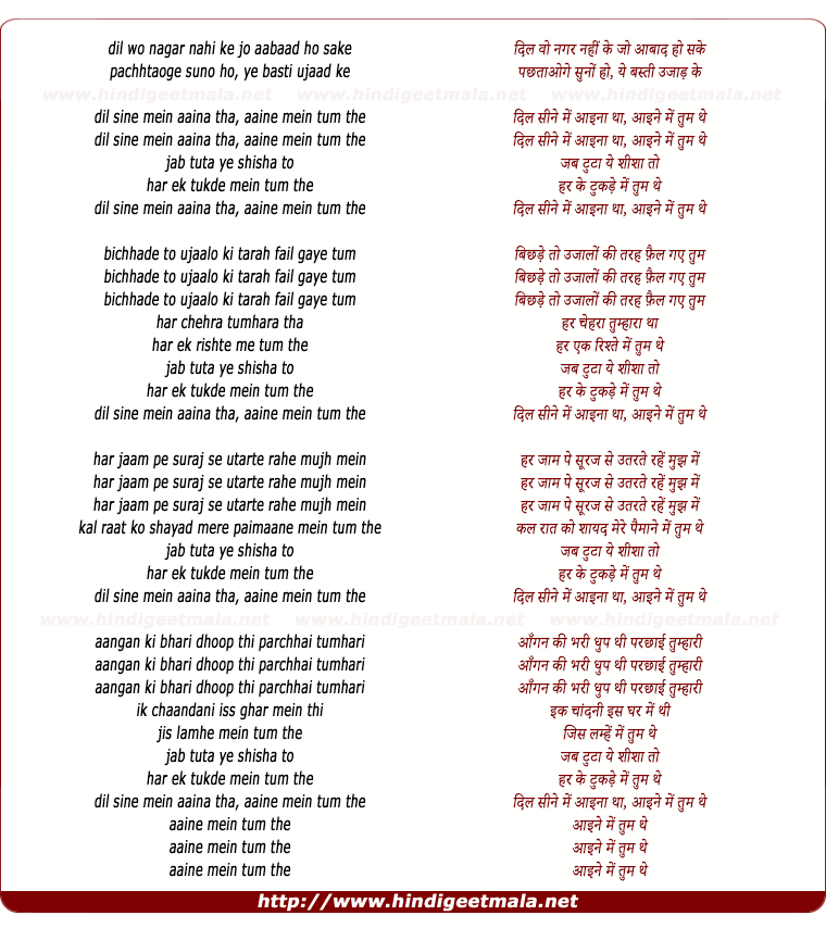 Lyrics of Dil Sine Mein Aayeena Tha - दिल वो नगर नहीं के जो आबाद हो सके