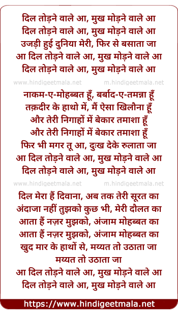 Lyrics of Dil Todne Wale Mukh Modne Wale - दिल तोड़ने वाले आ, मुख मोड़ने वाले आ