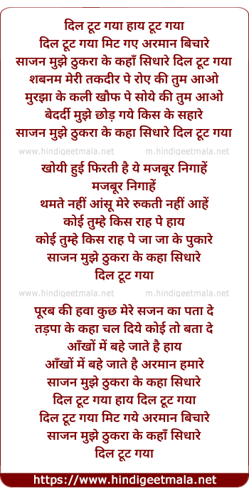 Lyrics of Dil Toot Gaya Mit Gaye Armaan Bichare - दिल टूट गया हाय टूट गया