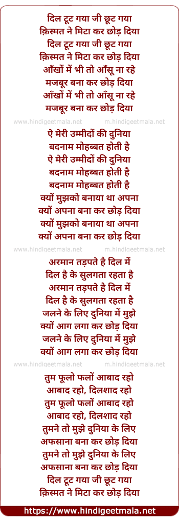 Lyrics of Dil Tut Gaya Ji Chhut Gaya - दिल टूट गया जी छूट गया