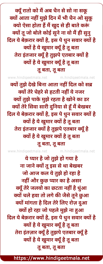 Lyrics of Dil Ye Bekarar Kyun Hai (Remix) - क्यूँ रातो को मैं अब चैन से सो ना सकू