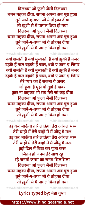 Lyrics of Dilarubaa O Phulon Jaisi Dilarubaa - दिलरुबा ओ फूलो जैसी दिलरुबा