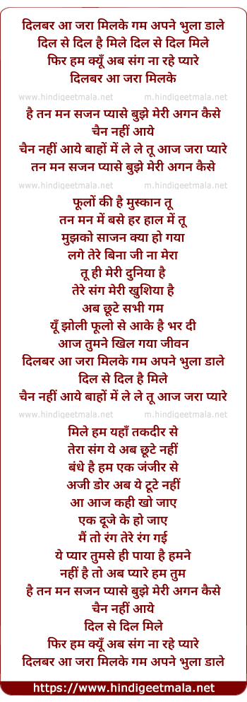 Lyrics of Dilbar Aa, Jara Milke Gum Apne Bhula Daale - दिलबर आ, जरा मिलके गम अपना भुला डाले