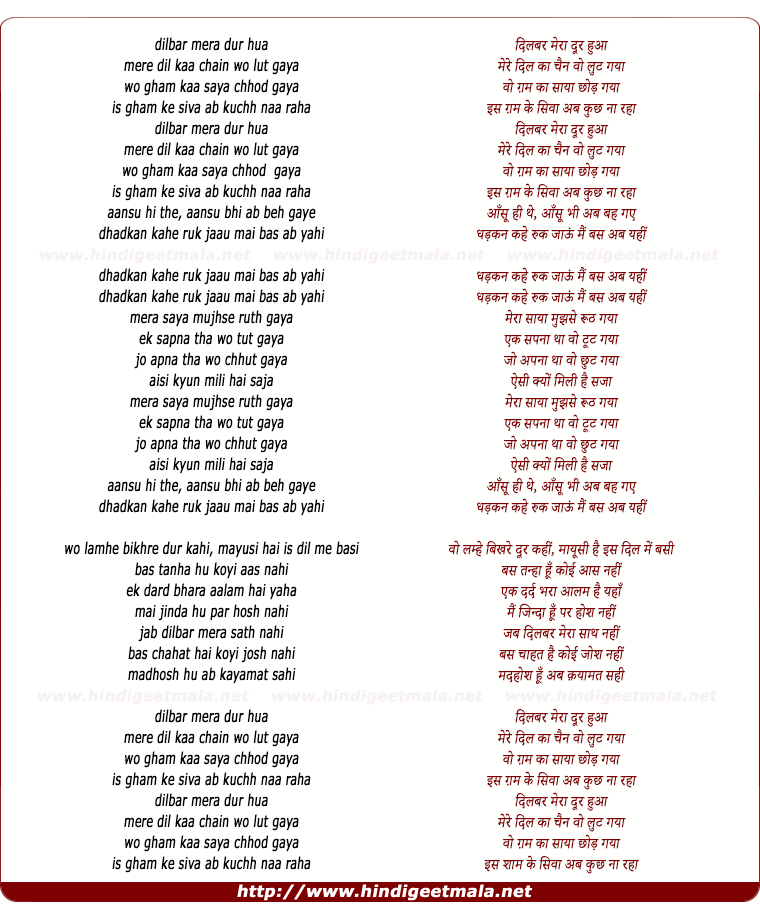 Lyrics of Dilbar Meraa Dur Huwaa - दिलबर मेरा दूर हुआ