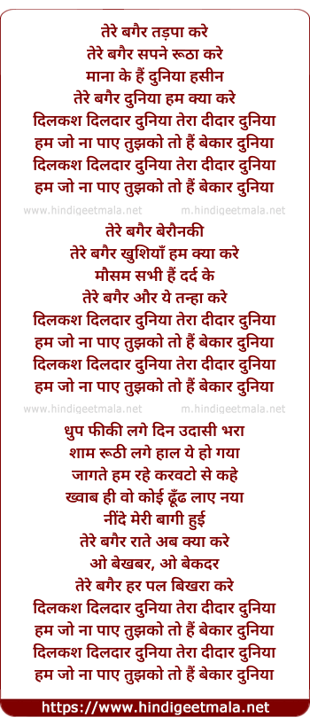 Lyrics of Dilkash Dildaar Duniya - तेरे बगैर तड़पा करे