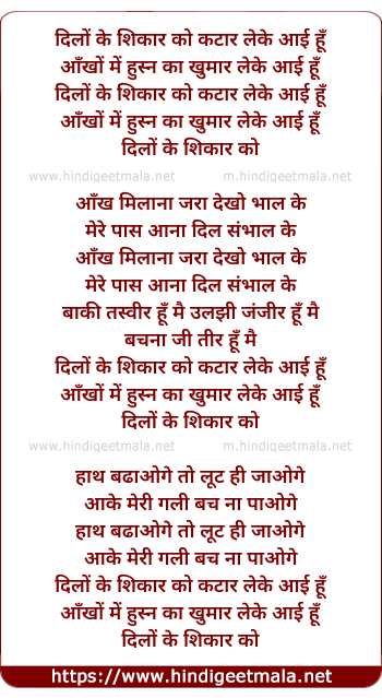 Lyrics of Dilo Ke Shikar Ko Katar Leke Aayi Hu - दिलों के शिकार को कटार लेके आई हूँ