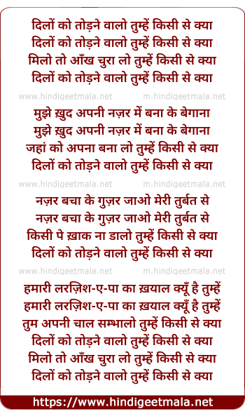 Lyrics of Dilon Ko Todane Waalo Tumhen Kisi Se Kyaa - दिलों को तोड़ने वालो तुम्हें किसी से क्या