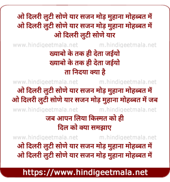 Lyrics of Dilri Looti Soniya Yaar Sajan - ओ दिलरी लुटी सोणे यार सजन मोड़ मुहाना मोहब्बत में