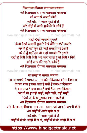 Lyrics of Dilwala Deewana Matwala Mastana - दिलवाला दीवाना मतवाला मस्ताना
