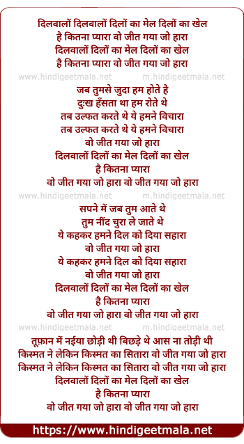Lyrics of Dilwalo Dilo Ka Mel Dilo Ka Khel Hai Kitna Pyara - दिलवालों दिलवालों दिलों का मेल दिलों का खेल