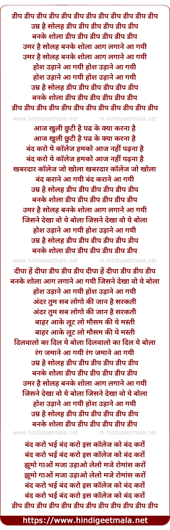 Lyrics of Umar Hai Solah Banke Shola, Aag Lagaane Aa Gayi - उमर है सोलह बनके शोला, आग लगाने आ गयी