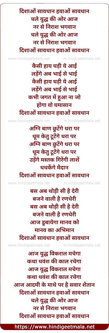 Lyrics of Dishao Savdhan Hawao Savdhan - दिशाओं सावधान हवाओं सावधान