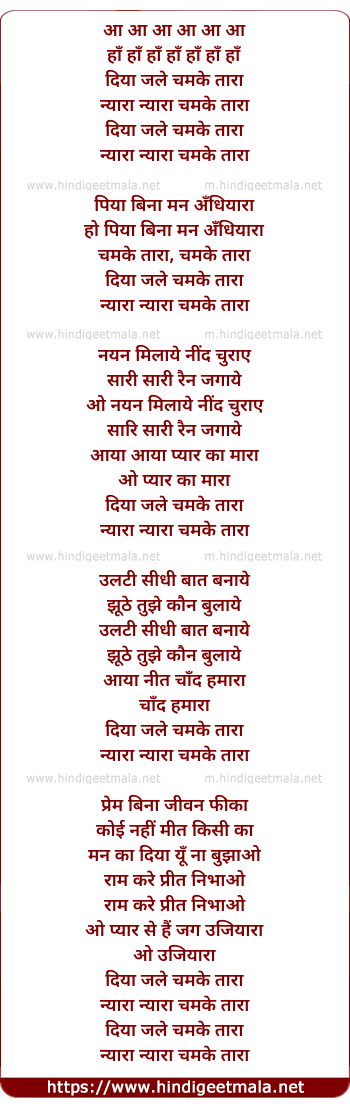Lyrics of Diya Jale Chamke Taara - दिया जले चमके तारा