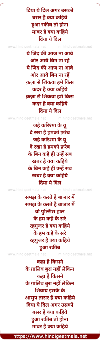 Lyrics of Diya Ye Dil Agar Usko - दिया ये दिल अगर उसको