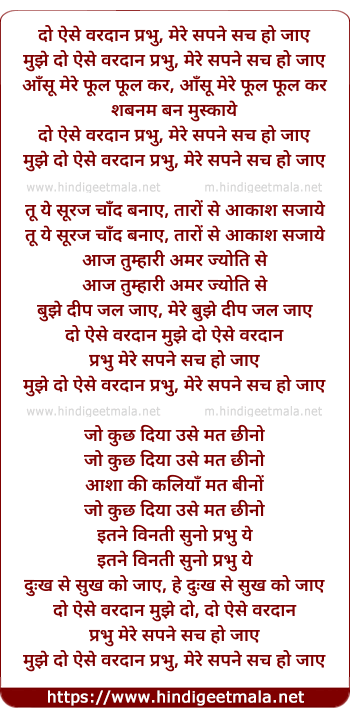 Lyrics of Do Aise Vardan Prabhu - दो ऐसे वरदान प्रभु, मेरे सपने सच हो जाए