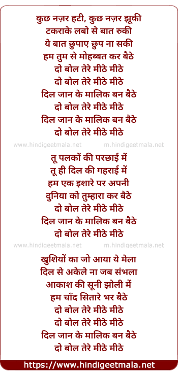 Lyrics of Do Bol Tere Meethe Meethe - दो बोल तेरे मीठे मीठे