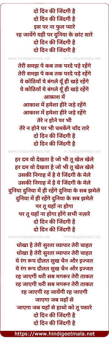 Lyrics of Do Din Ki Zindagi Hai - दो दिन की जिंदगी है