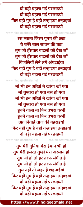 Lyrics of Do Ghadi Behla Gayi Parchaiya, Phir Wahi - दो घड़ी बहला गई परछाइयाँ, फिर वही