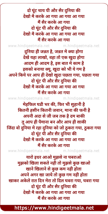 Lyrics of Do Ghoont Chai Pee, Aur Sair Duniya Ki Dekho Main Kar Ke Aa Gaya - दो घूंट चाय पी और सैर दुनिया की देखो मैं कर के आ गया