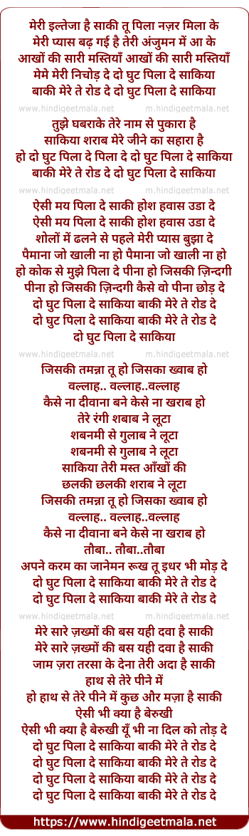 Lyrics of Do Ghunt Pila De Saakiya - दो घुट पिला दे साकिया