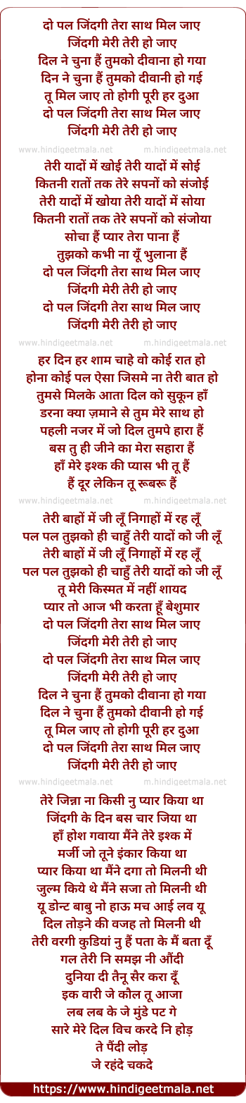 Lyrics of Do Pal Zindagi - दो पल जिंदगी तेरा साथ मिल जाए