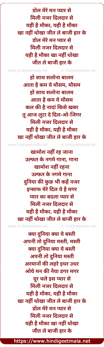 Lyrics of Dol Mere Man Pyar Se - डोल मेरे मन प्यार से