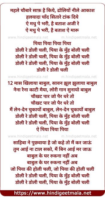 Lyrics of Doli Re Doli Chali - डोली रे डोली चली