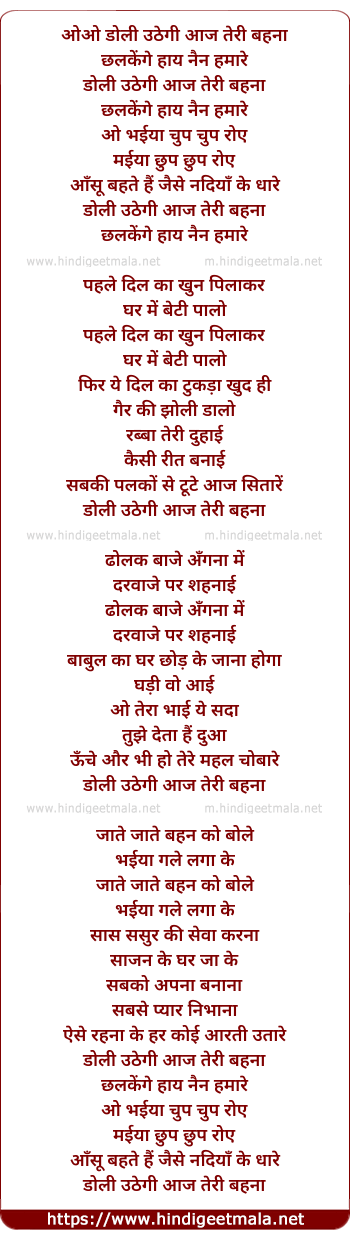 Lyrics of Doli Uthegi Aaj Teri Bahna - डोली उठेगी आज तेरी बहना
