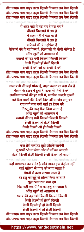 Lyrics of Don't Fuff My Mind - डोंट फफ्फ़ माय माइंड इट्स दिल्ली किस्मत लव पैसा दिल्ली