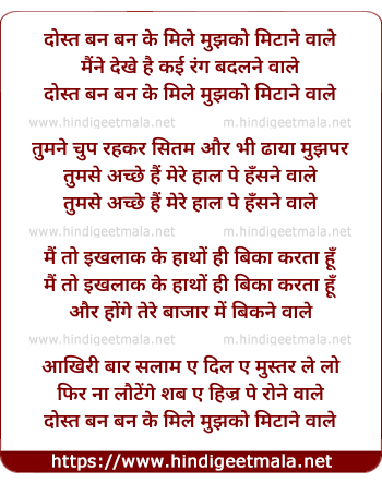 Lyrics of Dost Ban Ban Ke Mile Mujhako Mitaane Vaale - दोस्त बन बन के मिले मुझको मिटाने वाले