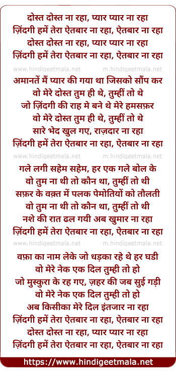 Lyrics of Dost Dost Na Raha Pyar Pyar Na Raha - दोस्त दोस्त ना रहा, प्यार प्यार ना रहा