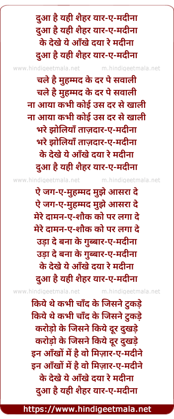 Lyrics of Dua Hai Yahi Tazdar Madina Ki Dekhe - दुआ है यही शैहर यार-ए-मदीना