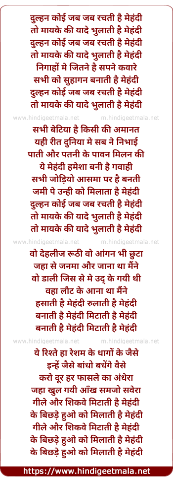 Lyrics of Dulhan Koi Jab Jab Rachati Hai Mahndi - दुल्हन कोई जब जब रचती है मेहंदी