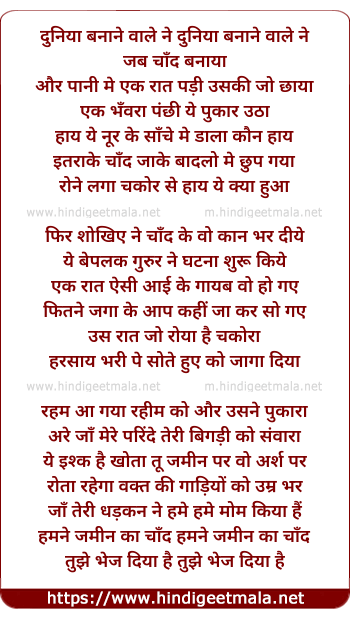 Lyrics of Duniya Banane Wale Ne Jab Chand Banaya - दुनिया बनाने वाले ने जब चाँद बनाया