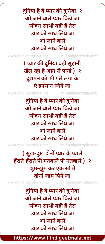 Lyrics of Duniya Hai Ye Pyar Ki Duniya - दुनिया है ये प्यार की दुनिया -२