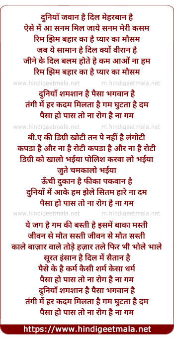 Lyrics of Duniya Jawan Hai Dil Meharban Hai - दुनियाँ जवान है दिल मेहरबान है