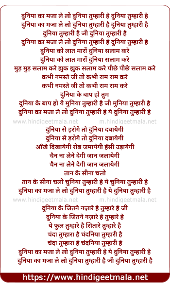 Lyrics of Duniya Ke Maze Le Le - दुनिया का मजा ले लो दुनिया तुम्हारी है दुनिया तुम्हारी है