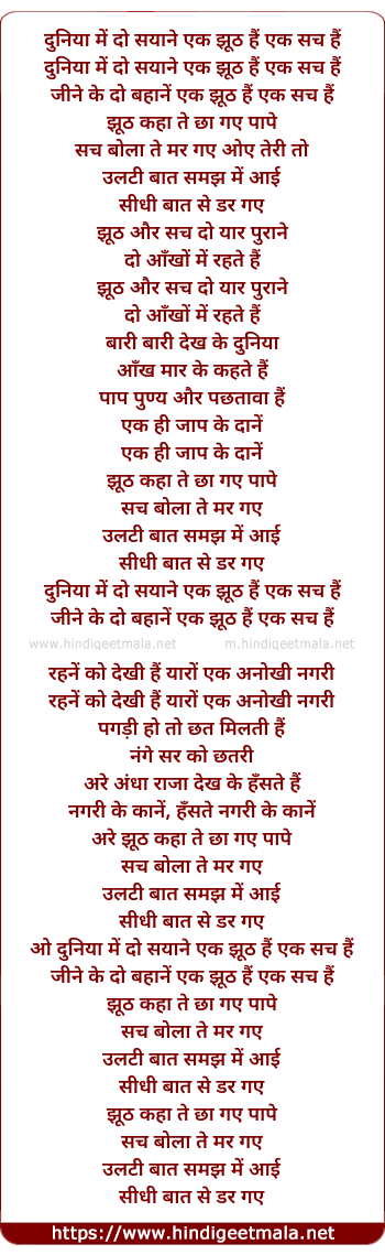Lyrics of Duniyaa Me Do Sayane - दुनिया में दो सयाने