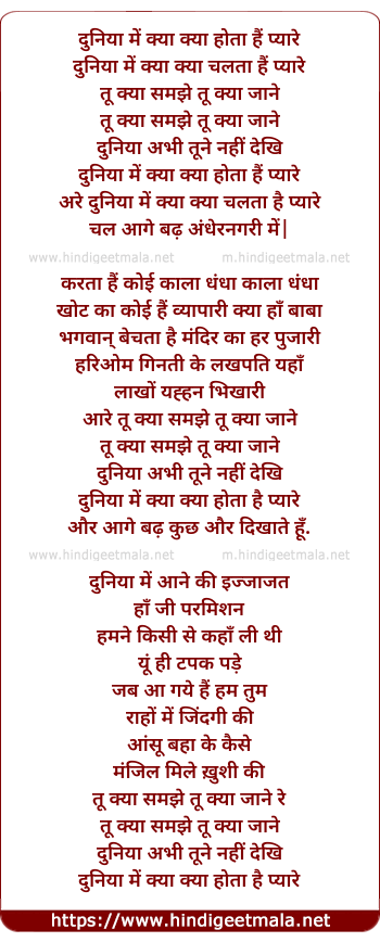 Lyrics of Duniya Me Kya Kya Hota Hai Pyare