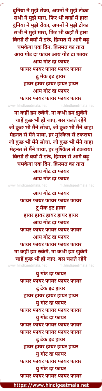 Lyrics of Duniya Nay Mujhe Roka - The Fire - दुनिया ने मुझे रोका, अपनों ने मुझे टोका