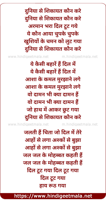 Lyrics of Duniya Se Shikayat Kaun Kare - दुनिया से शिकायत कौन करे
