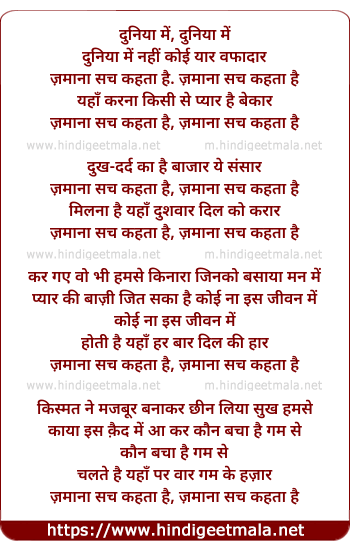 Lyrics of Duniyaa Men Nahi Zamaanaa Sach Kahataa Hai - दुनिया में नहीं जमाना सच कहता है