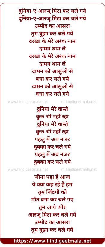 Lyrics of Duniya-E-Aarzoo Mita Kar Chale Gaye - दुनिया-ए-आरजू मिटा कर चले गये