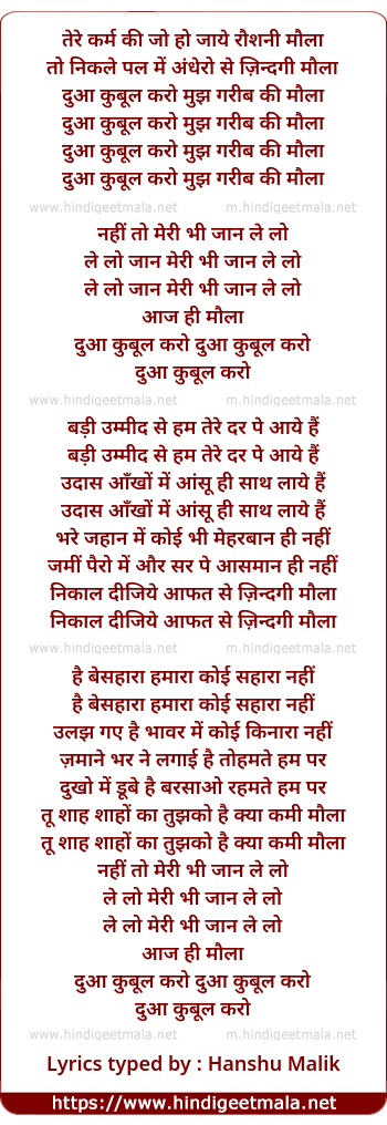 Lyrics of Duwa Kubul Karo Mujh Garib Kee Maula - दुआ कुबूल करो मुझ गरीब की मौला