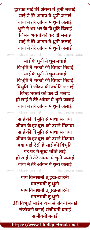Lyrics of Dwaraka Mai Tere Angan Me Dhuni Jalai - द्वारका माई तेरे अंगना मे धुनी जलाई