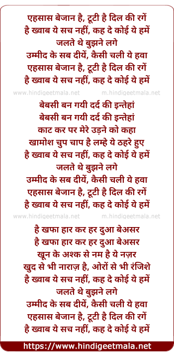 Lyrics of Ehsaas Bejaan Hai Tuti Hai Dil Ki Ragein - एहसास बेजान है टूटी है दिल की रगें