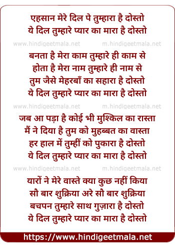 Lyrics of Ehsan Mere Dil Pe Tumhara Hai Dosto - एहसान मेरे दिल पे तुम्हारा है दोस्तो